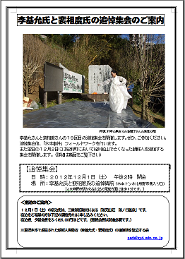 ★以下の集会は終わりました。★ ★2012年12月1日(土)、2日(日)、 第19回 三重県木本で虐殺された朝鮮人労働者李基允さんと「相度さんを追悼する集会と第5回 紀州鉱山で亡くなった朝鮮人を追悼する集会を行ないました。★ たくさんのご参加、ご協力をいただき、どうもありがとうございました。